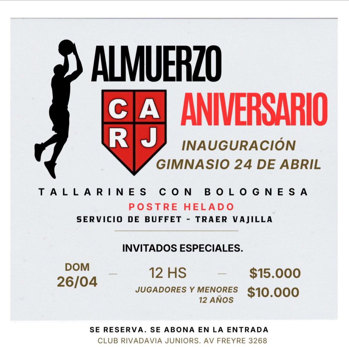 Por ello, como cada año, lo celebraremos con el tradicional almuerzo familiar y entre amigos de nuestro querido Rojo. El encuentro será el domingo 26 de abril en el club, desde las 12 hs.